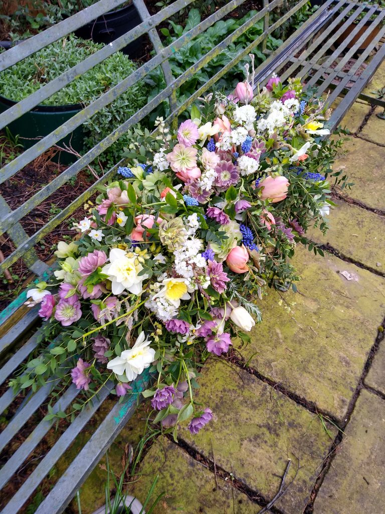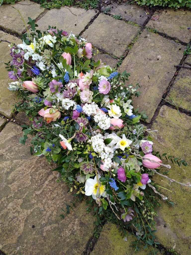 I chose the plum blossom in white from my own tree at home. I wanted something pretty and pale in colour to complement the rest of the arrangement. I also felt strongly that a spring funeral should have spring blossom to reflect the countryside around us at this moment in time. The next time I see spring blossom in the hedgerows I will think of Mum.